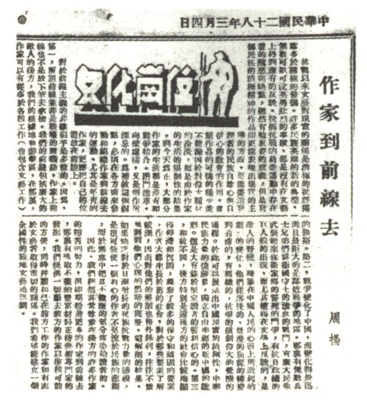 《救亡日报》发表周扬文章《作家到前线去》